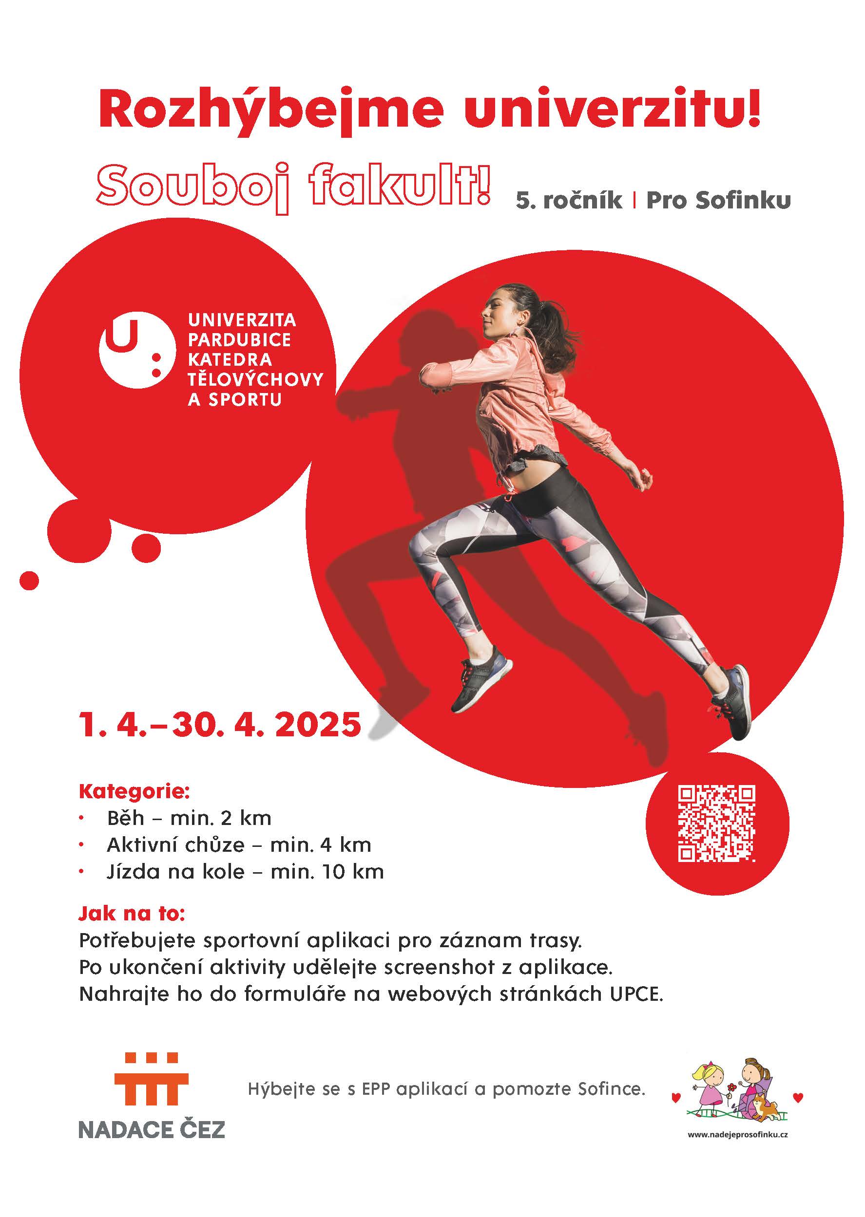 Jarní výzva, kterou pořádá Katedra tělovýchovy a sportu Univerzity Pardubice, odstartovala symbolicky 1. dubna.  Do akce se mohou během celého měsíce připojit zájemci, kteří se rozhodnou sportovat chůzí, během nebo jízdou na kole.  Pro zapojení do soutěže jednotlivců nebo souboje fakult stačí ujit 4 km, uběhnout minimálně 2 km nebo na kole ujet trasu alespoň 10 kilometrů. Každou trasu si univerzitní sportovci i dál mohou měřit pomocí doporučené speciální mobilní aplikace EPP, která umožňovala pomoc Sofince. Podpořit je možné další z projektů, které si vyberou.