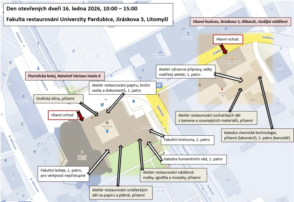24. 4 – 24. 5. 2024 Fakulta restaurování, UPCE, Litomyšl kontakt Ateliér restaurování sochařských děl z kamene a souvisejících materiálůAteliér restaurování papíru, knižní vazby a dokumentůAteliér restaurování nástěnné malby, sgrafita a mozaikyAteliér restaurování uměleckých děl na papíru a plátněAteliér výtvarné přípravyKatedra humanitních vědKatedra chemické technologie Fakulta restaurování, Jiráskova 3, Litomyšl Bc. Zdeňka Vymazalová, DiS. zdenka.vymazalova@upce.cz 466036590